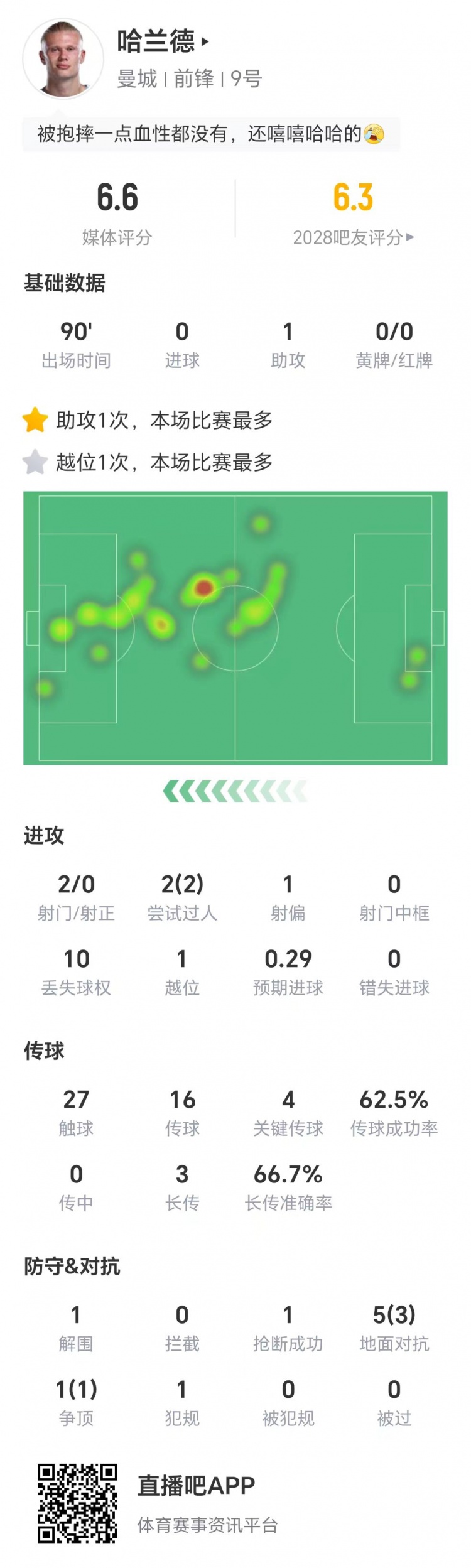赛后技术统计数据显示,哈兰德本场比赛两射零正,两次过人成功,4次关键传球,1次解围,1次抢断,5次地面对抗成功3次,获评6.6分。