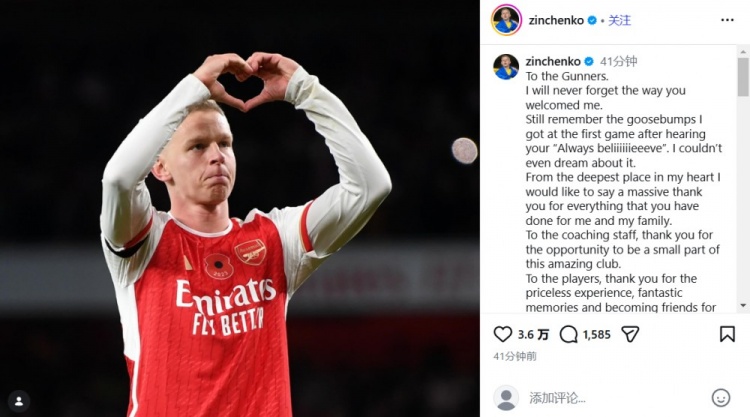 2月2日讯 阿森纳后卫津琴科转会加盟阿贾克斯,乌克兰人在社交媒体上对老东家表示了感谢。
