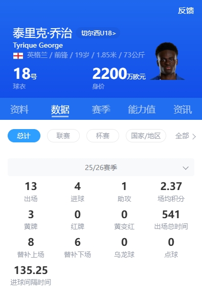 乔治今年19岁,司职前锋,本赛季为切尔西出场13场有4个进球。