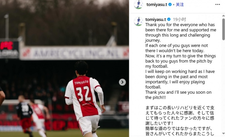 2月3日讯 阿贾克斯球员富安健洋更新社媒,纪念自己重返球场。
