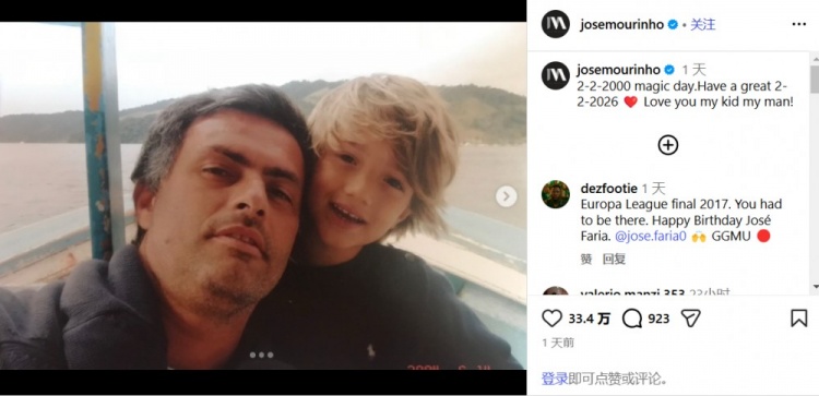 穆里尼奥写道:2000年2月2日,这是一个神奇的日子。2026年2月2日,祝你度过美妙的一天。爱你,我的孩子,我的宝贝!