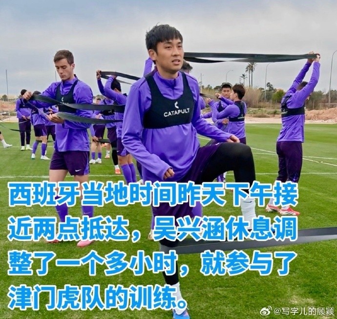 西班牙当地时间昨天下午,吴兴涵与津门虎俱乐部会合。休息调整了一个多小时,他就身披训练服参加了津门虎队的训练。
