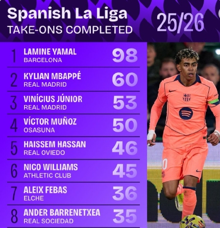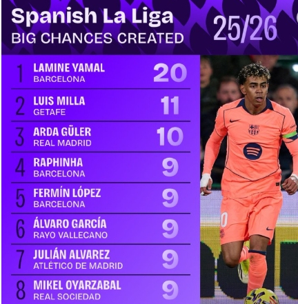 全面!亚马尔西甲霸榜数据:过人、绝佳机会创造、成功对抗、助攻