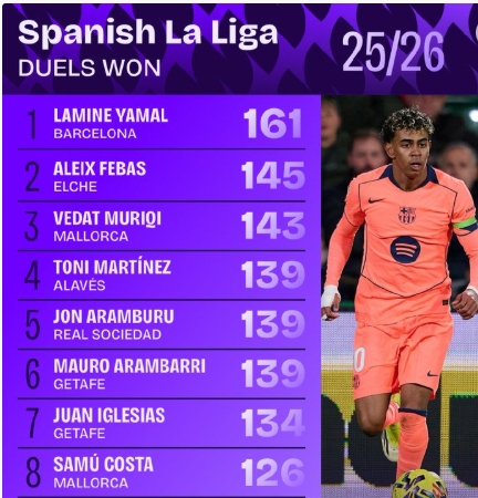 02月05日讯 本赛季西甲截止至今,据Squawka统计,亚马尔在多项数据霸榜。