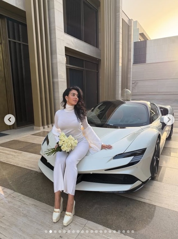 这组动态中还有乔治娜手捧鲜花与法拉利合影的照片,法拉利SF 90 Stradale Assetto Fiorano的零售价约为44万英镑,有些车型的售价甚至更高。