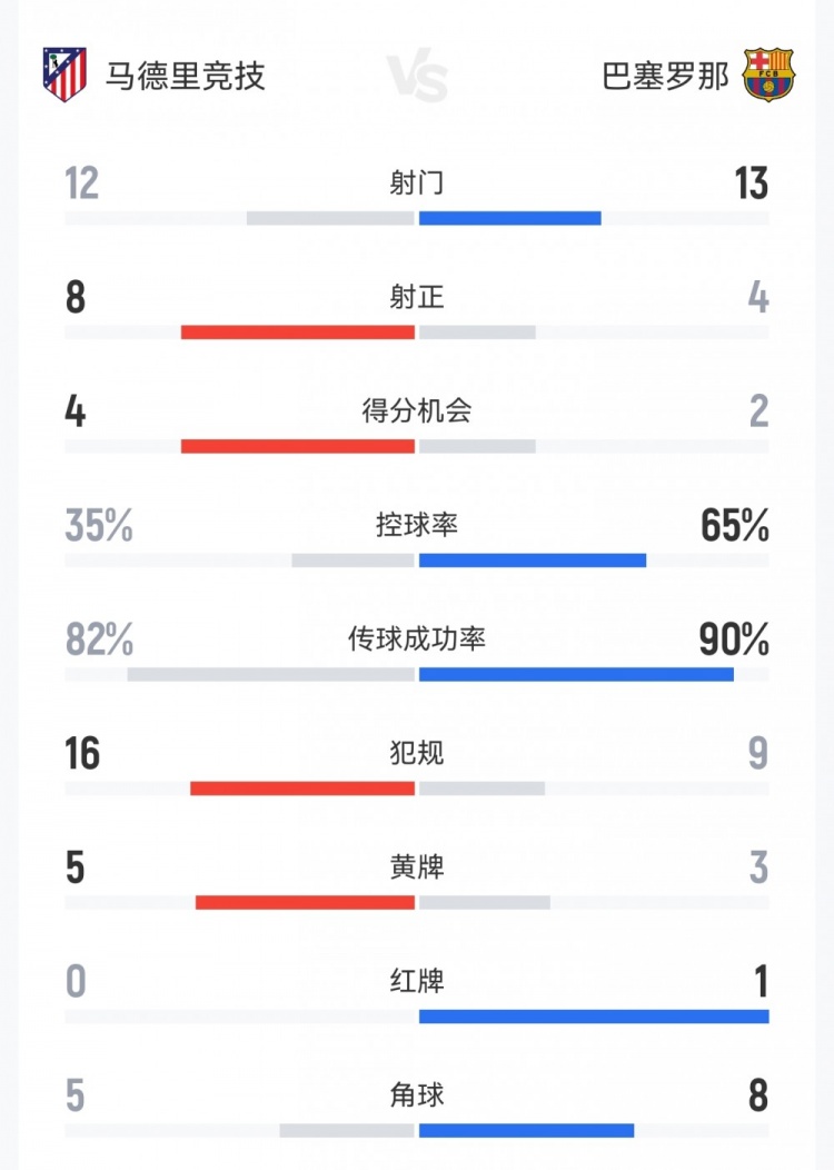效率制胜!马竞4-0巴萨数据:射门12-13,射正8-4,得分机会4-2