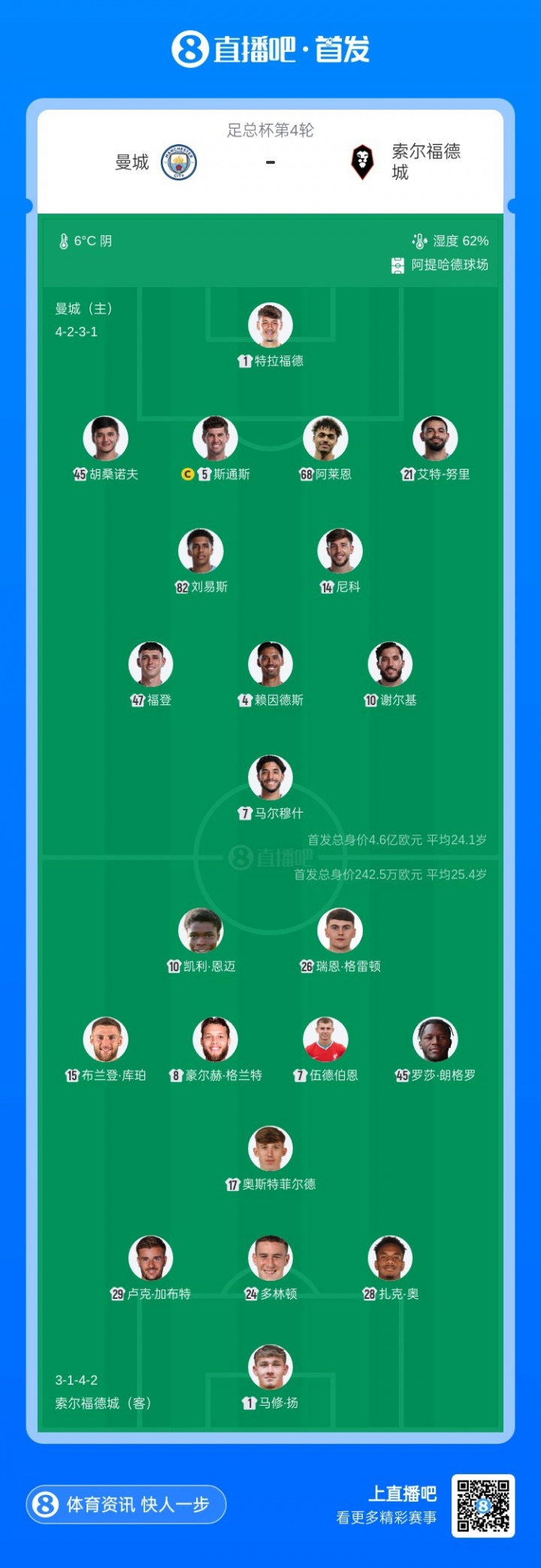 足总杯-曼城vs索尔福德城首发:斯通斯、福登先发,哈兰德缺阵