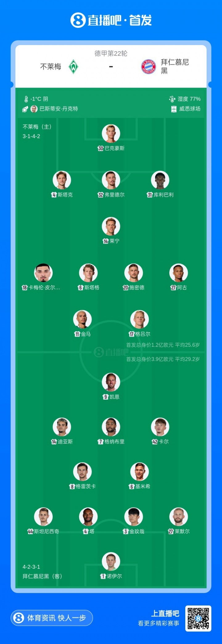 拜仁客战不莱梅首发:凯恩、迪亚斯领衔,卡尔、格雷茨卡出战