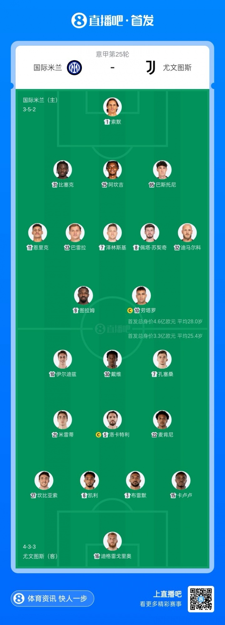国米首发:1-索默、31-比塞克、25-阿坎吉、95-巴斯托尼、11-恩里克、23-巴雷拉、7-泽林斯基、8-苏契奇、32-迪马尔科、10-劳塔罗、9-图拉姆