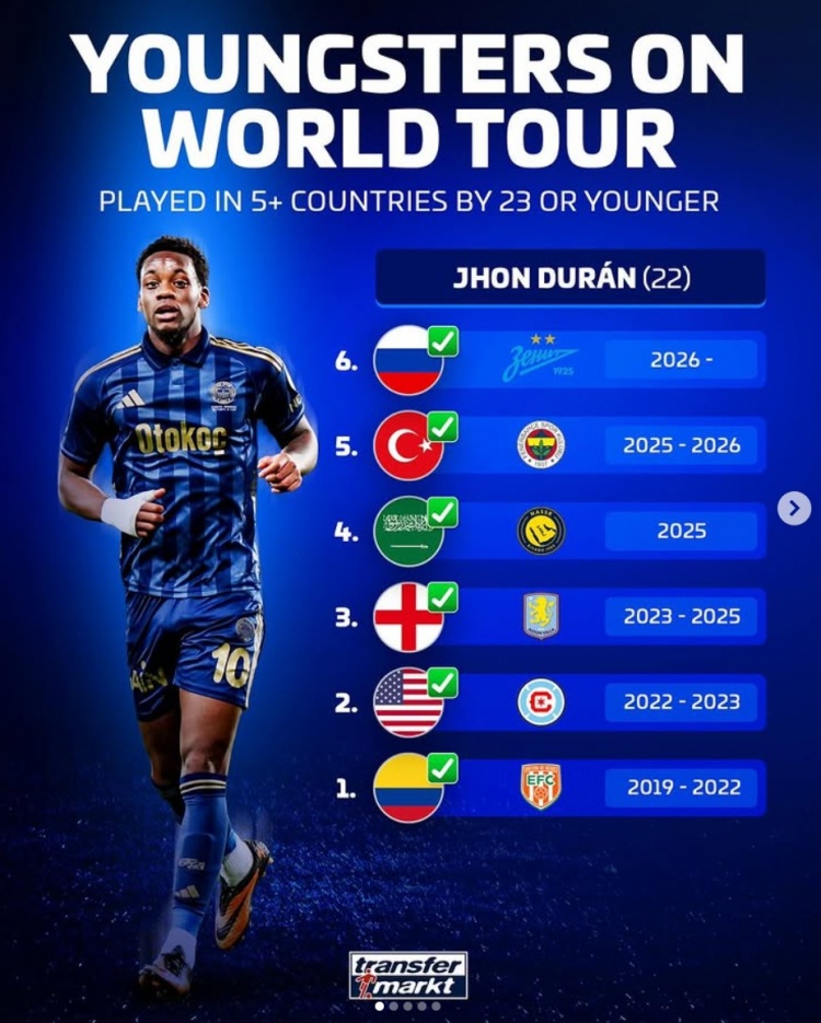 杜兰(22岁):泽尼特(俄罗斯)、费内巴切(土耳其)、利雅得胜利(沙特)、阿斯顿维拉(英格兰)、芝加哥火焰(美国)、恩维加多(哥伦比亚)