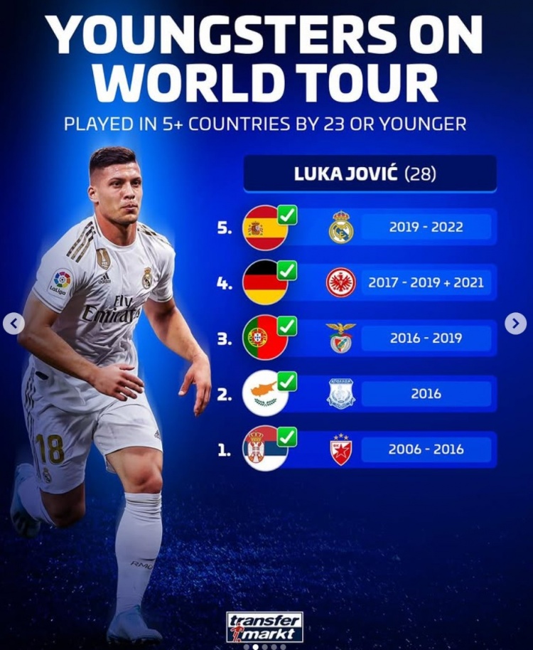 约维奇(28岁):皇马(西班牙)、法兰克福(德国)、本菲卡(葡萄牙)、阿波隆利马索尔(塞浦路斯)、贝尔格莱德红星(塞尔维亚)