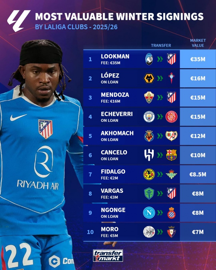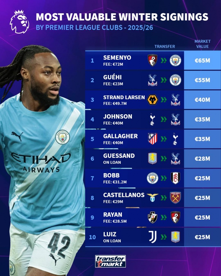 五大联赛冬窗新援德转身价榜:英超塞梅尼奥居首,西甲卢克曼夺魁