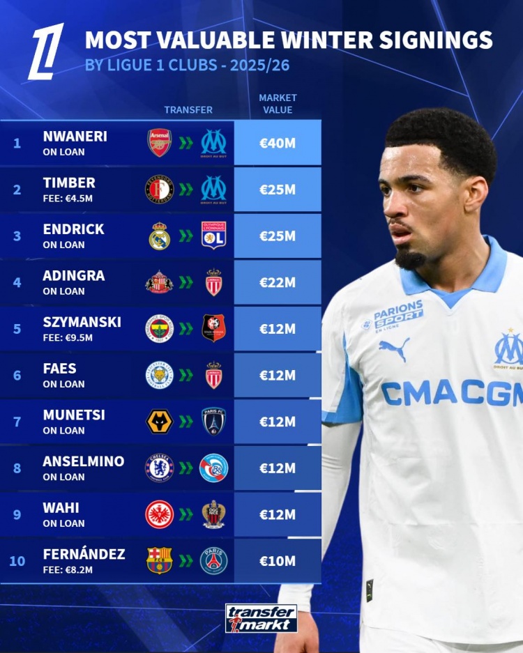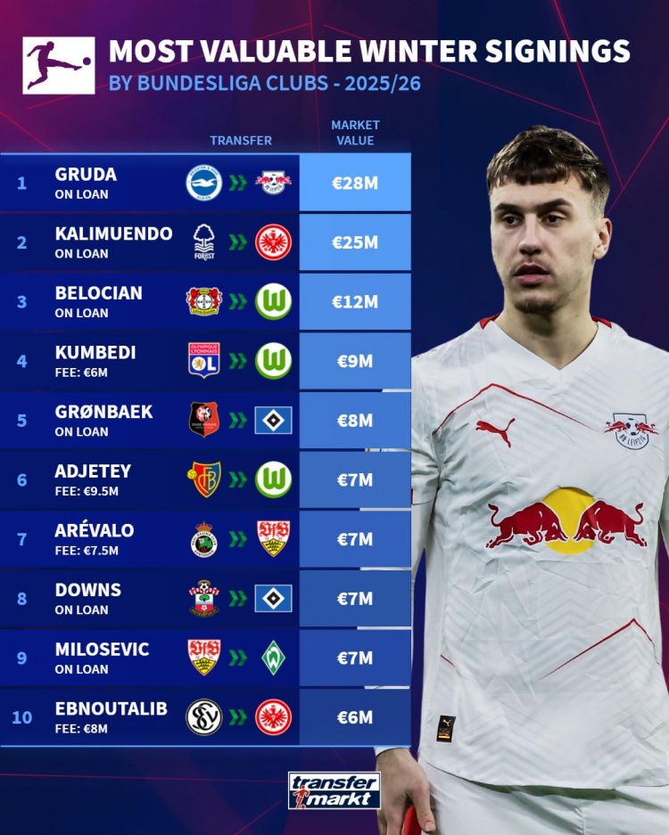 2月16日讯 德国转会市场统计了今年各联赛新援的身价,并列出榜单。