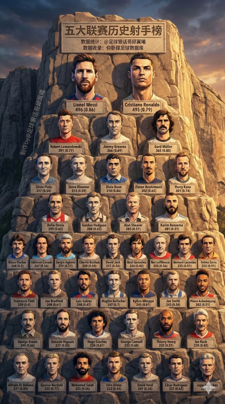 注:皮奥拉意甲官方总进球数为274球,本数据加上了1943-44和1944-45特殊时期两个赛季意大利顶级联赛数据,皮奥拉总共为317球,这个数据是IFFHS认可的版本。