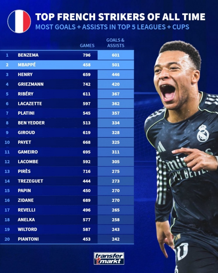 法国球员参与进球榜:本泽马601球居首,姆巴佩501球次席