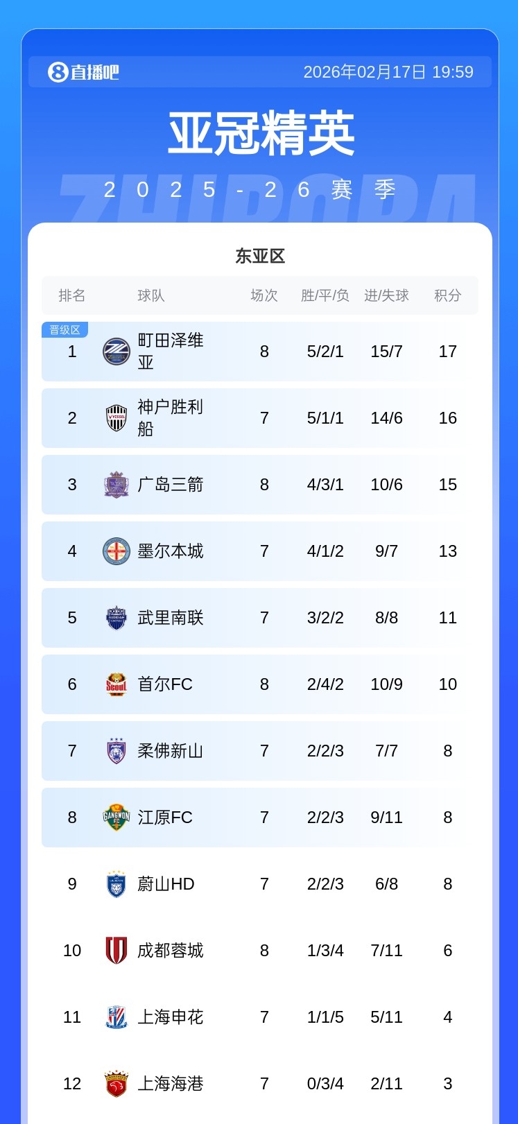 02月17日讯 亚冠精英联赛东亚区第8轮,成都蓉城2-3不敌町田泽维亚,自此本赛季参加亚冠精英联赛和亚冠二级联赛的4支中超球队已经全部出局,均未能晋级淘汰赛。