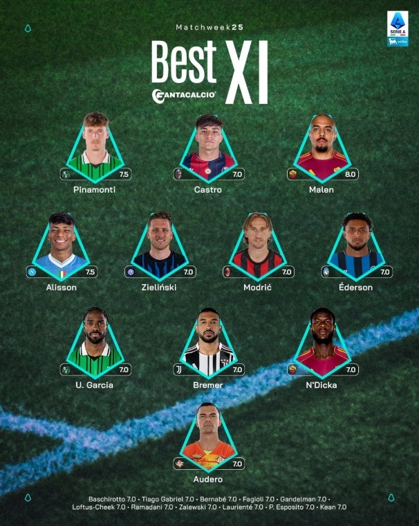 意甲第25轮最佳阵:奥代罗(克雷莫内塞);乌利塞斯·加西亚(萨索洛)、布雷默(尤文)、恩迪卡(罗马);阿利森·桑托斯(那不勒斯)、泽林斯基(国米)、莫德里奇(米兰)、埃德森(亚特兰大);皮纳蒙蒂(萨索洛)、卡斯特罗(博洛尼亚)、马伦(罗马)