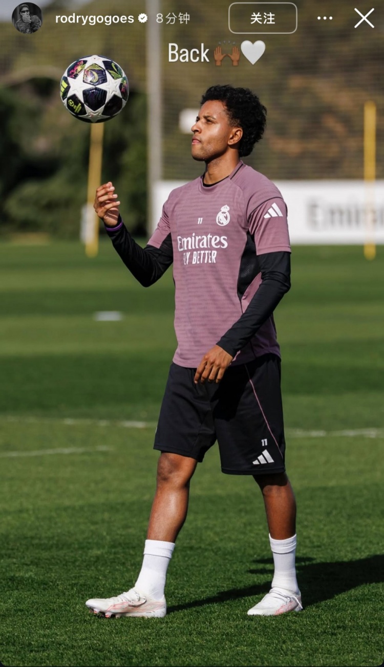 2月22日讯 今日,皇马前锋罗德里戈更新社媒,晒出自己回归队内训练的照片,并配文写道:“重返绿茵场