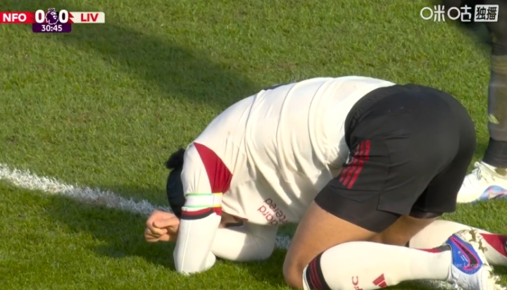 比赛第32分钟,范戴克封堵射门时被闷到后脑勺,随后倒地缓了缓。