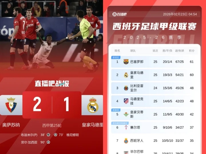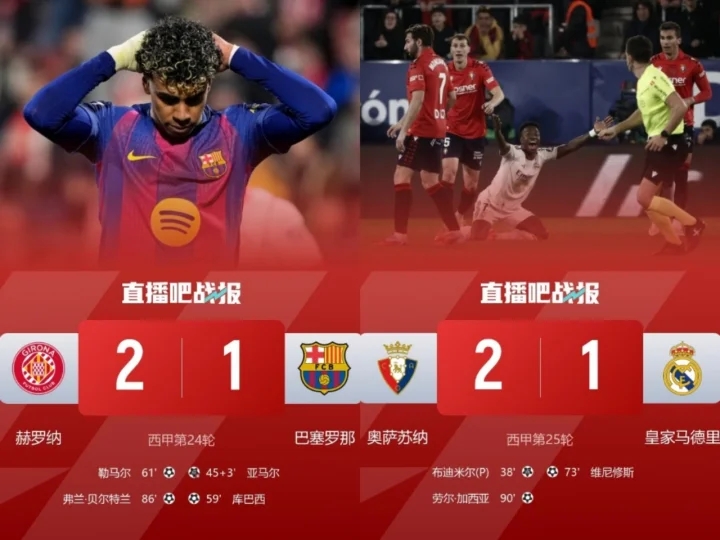本轮西甲,皇马在客场1-2遭奥萨苏纳绝杀,巴萨获得机会实现超分。