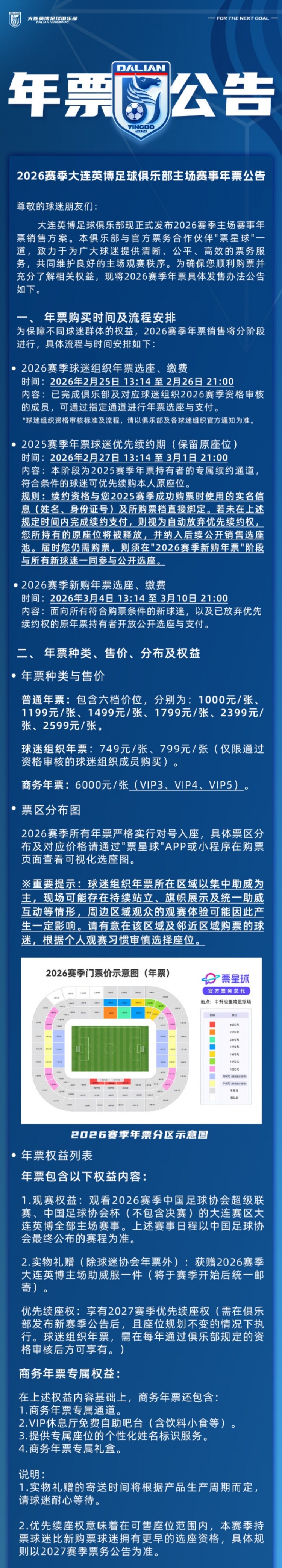 2月25日讯 大连英博发布2026赛季主场赛事年票公告,同时也发布了散票价格。