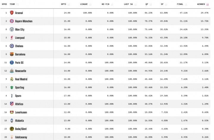 opta预测欧冠冠军概率:阿森纳29.47%最高拜仁第二,皇马低于纽卡