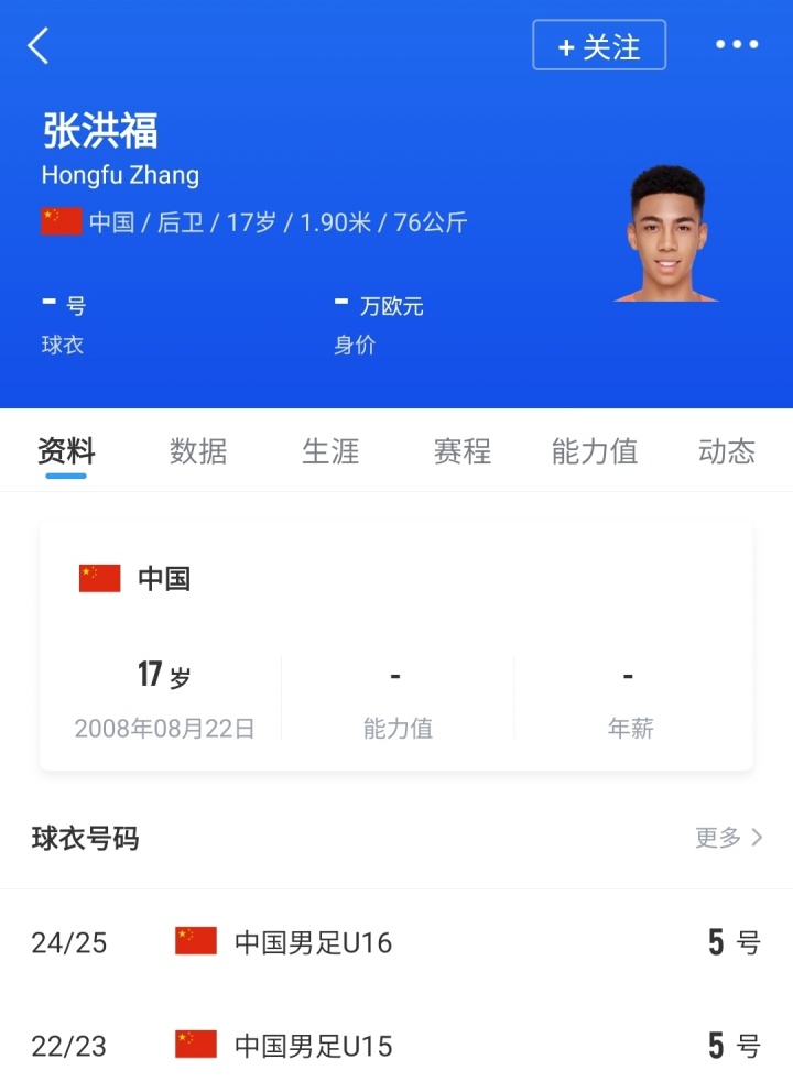 张洪福出生于2008年8月22日,身高1.90米,场上司职中后卫。他拥有出色的天赋与领袖气质,身体对抗强硬、回追速度快,兼具精准长短传与防线指挥能力;进攻端制空优势突出,定位球进攻屡有斩获。
