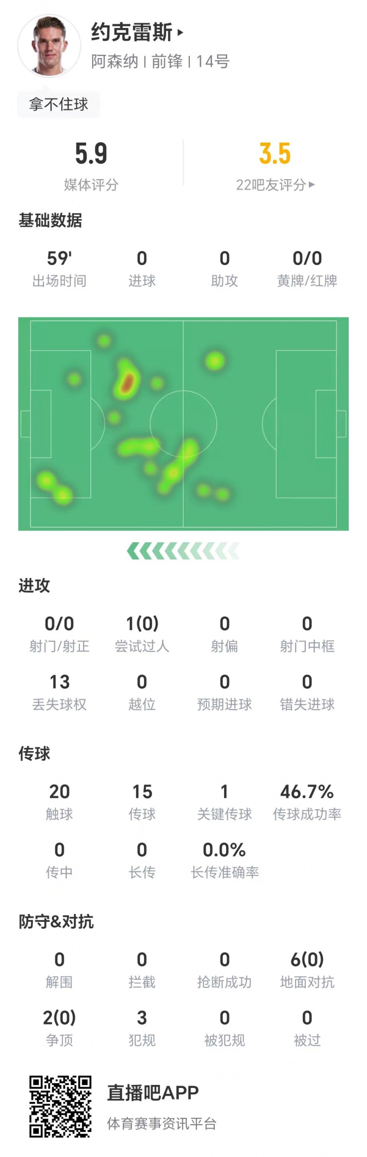 技术统计数据显示,约克雷斯本场比赛零射门,1次过人未能成功,1次关键传球。另外,他6次地面对抗零成功,两次争顶也未能成功,获评5.9分。