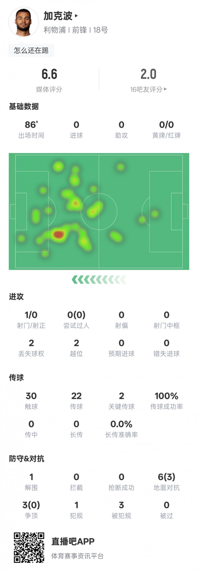 加克波本场数据:1射门0射正2关键传球3地面对抗成功,评分6.6