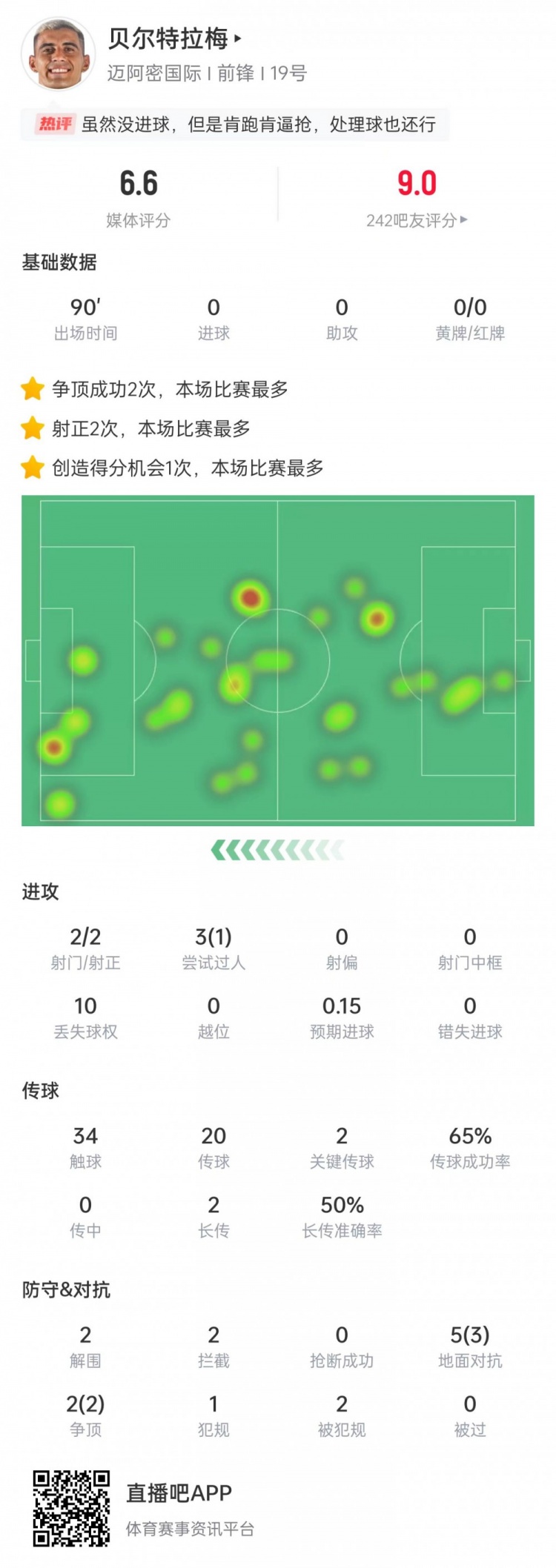 此役贝尔特拉梅为迈阿密国际踢满全场,送出2记关键传球,2次拦截+2次抢断,7次对抗5次成功,当选本场比赛最佳球员。
