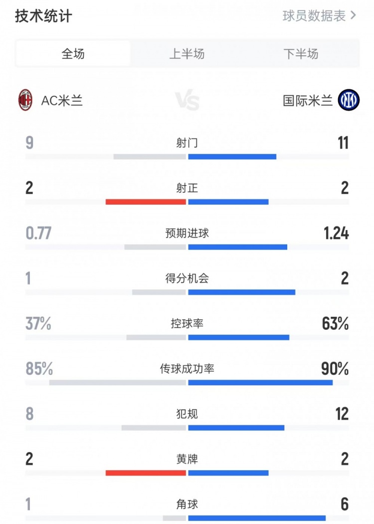 米兰1-0国米全场数据:射门9比11、射正2比2、控球率37%比63%