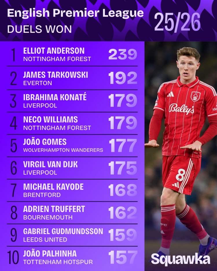 3月9日讯 Squawka统计了本赛季球员在英超的对抗成功次数,并列出榜单,安德森是唯一对抗成功超过200次的球员。
