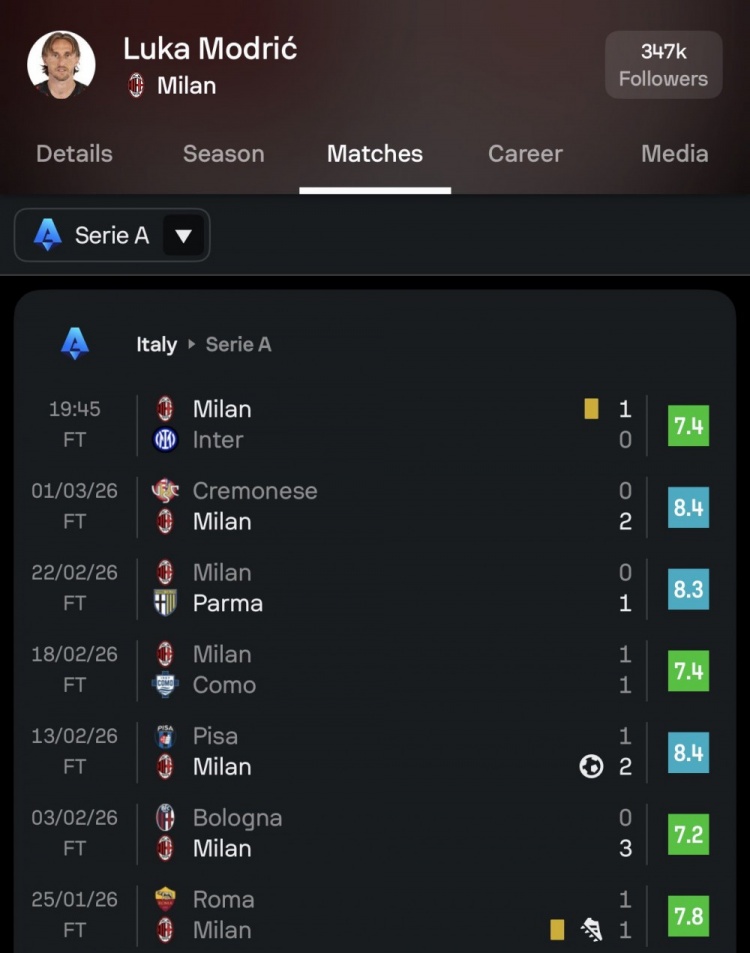 Sofascore此役对莫德里奇给出7.4分,这位40岁的中场近7场比赛评分均高于7分,场均评分7.8。