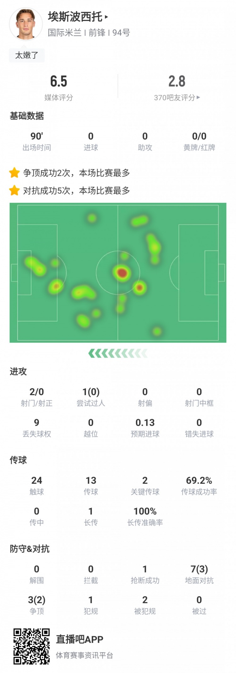 3月9日讯 国米在本轮意甲0-1输给米兰,以下是首发出场的皮奥·埃斯波西托的全场数据。