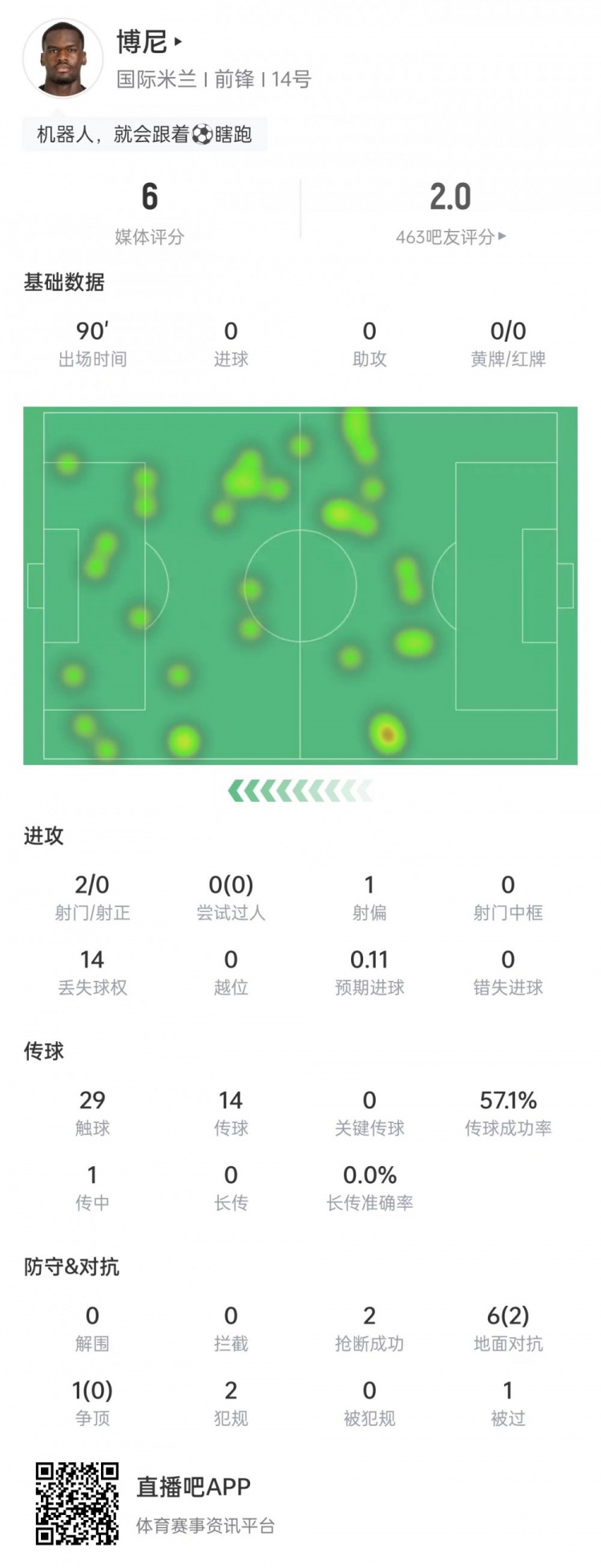 博尼本场数据:2次射门0射正,7次对抗2次成功,获评6分全场最低