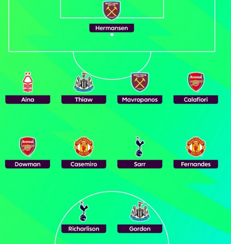 前锋:里沙利松(热刺)、戈登(纽卡)