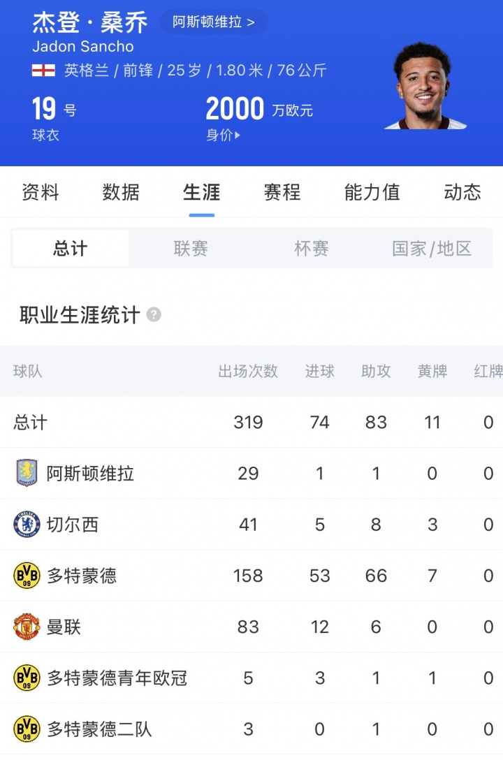 桑乔现年25岁,他本赛季被租借至维拉,赛季29场1球1助。他的周薪20万镑,与曼联的合同今夏到期,现身价2000万欧。在效力多特期间,桑乔一共出场158次,贡献53球66助。