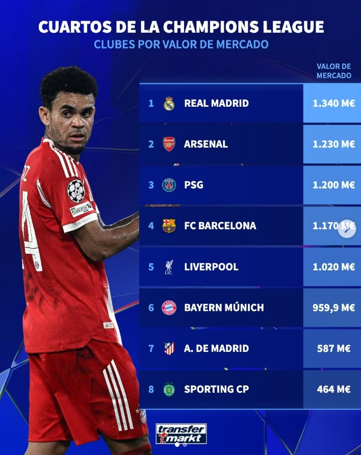 3月19日讯 本赛季欧冠8强全部产生,德转也列出8强球队身价榜,具体如下: