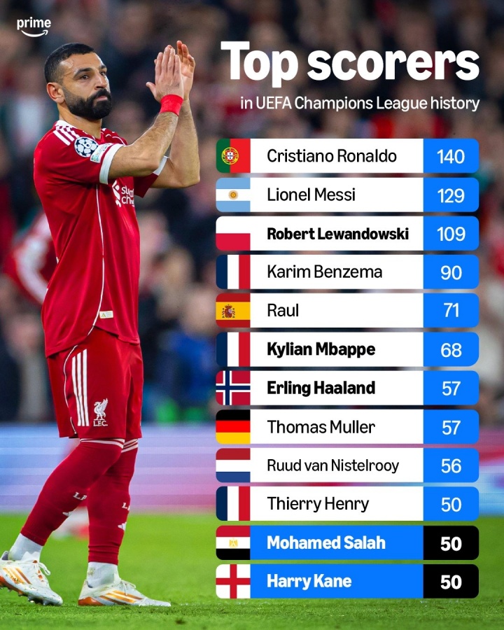 03月19日讯 本赛季欧冠1/8决赛全部结束,外媒统计了欧冠历史射手榜,C罗140球位居榜首,梅西、莱万分列二三。萨拉赫、凯恩均达成各自的欧冠生涯50球,跻身榜单前十。