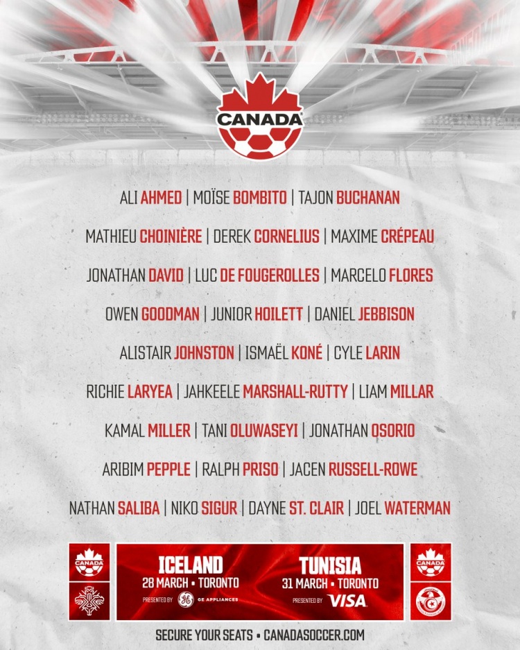 3月20日讯 加拿大国家队公布新一期名单,戴维领衔,阿方索·戴维斯缺席,加拿大将在友谊赛中对阵冰岛、突尼斯。