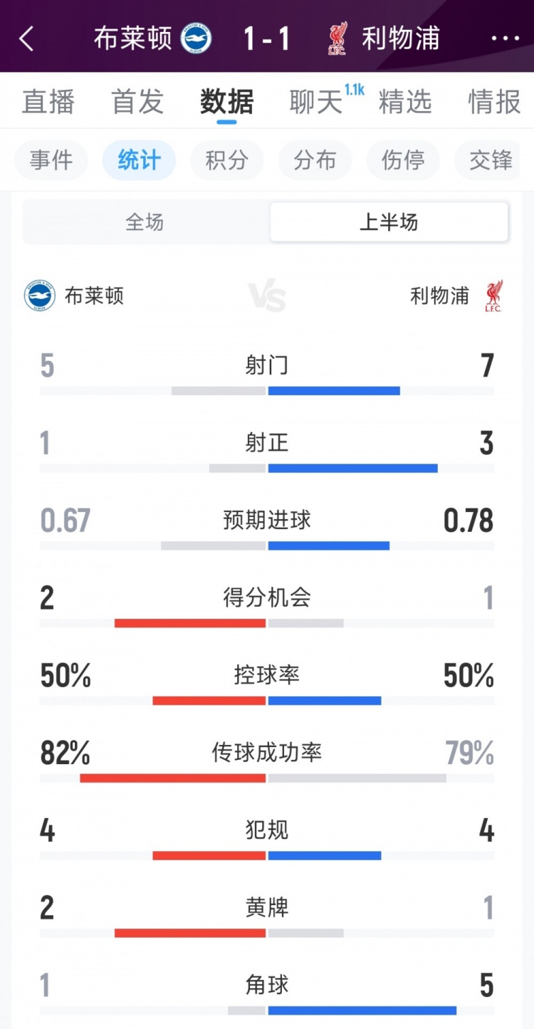 3月21日讯 本轮英超利物浦对阵布莱顿上半场战罢,双方暂时1-1战平,以下为双方半场数据对比: