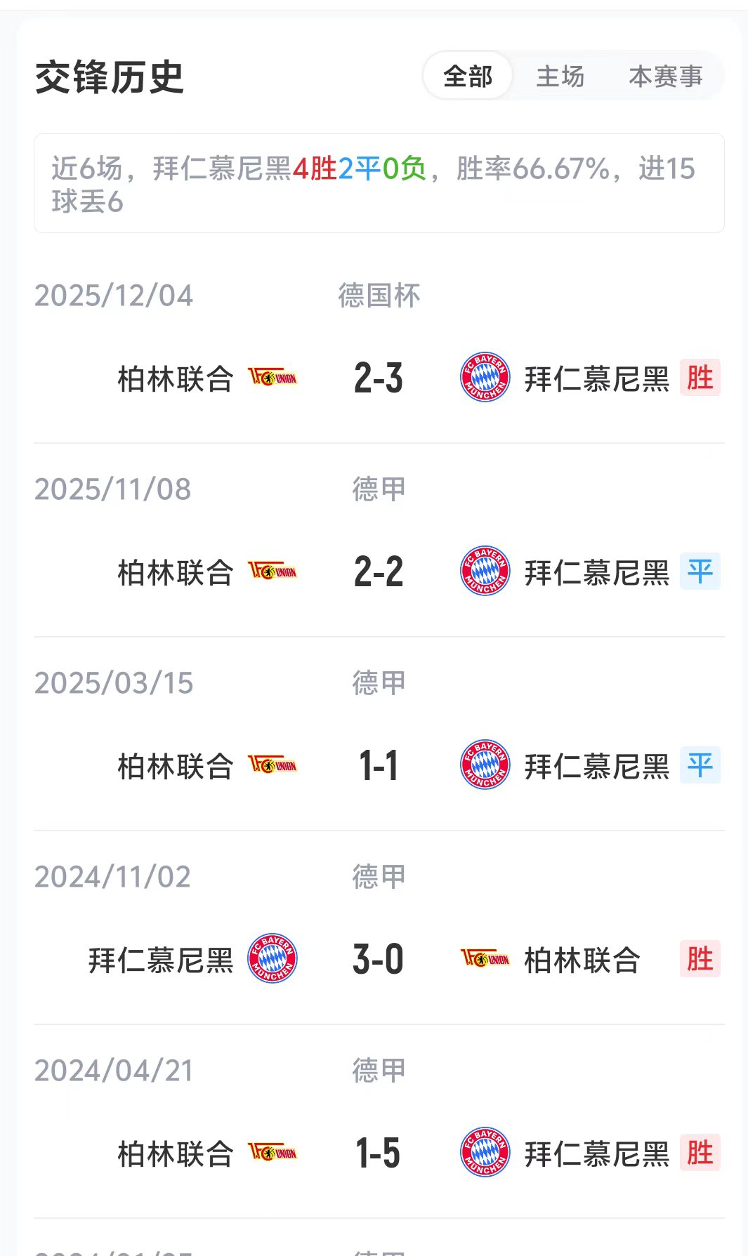 拜仁近6轮联赛5胜1平,柏林联合近5轮联赛2胜3负。