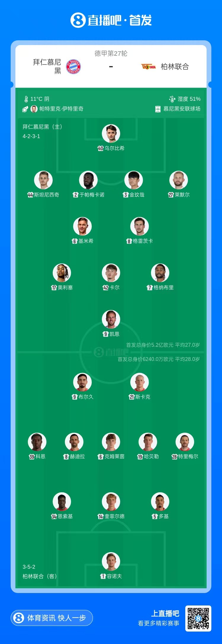 拜仁vs柏林联合首发:凯恩、奥利塞先发,卡尔、格纳布里出战