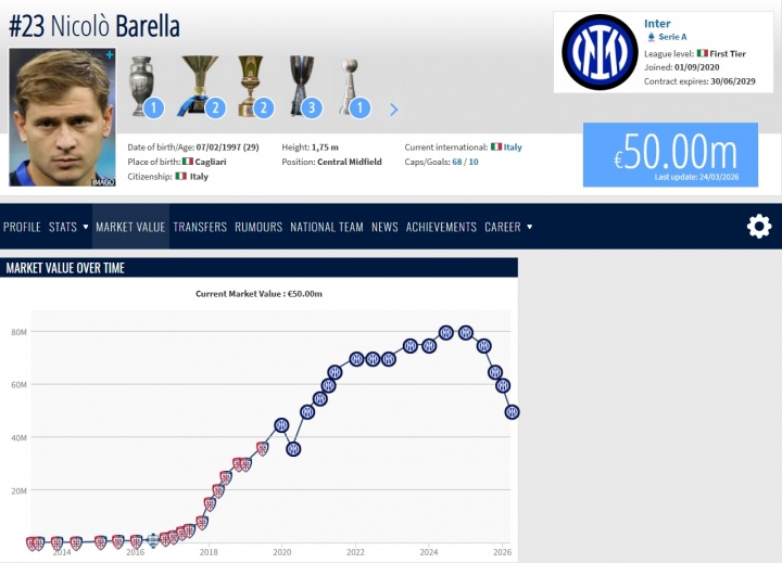 自2024年年底以来,巴雷拉的身价一路从生涯最高的8000万欧跌到7500万、6500万欧、6000万欧以及今天的5000万欧。目前巴雷拉的身价仍排在意大利籍球员第三,意甲球员第六,国米队内第三。