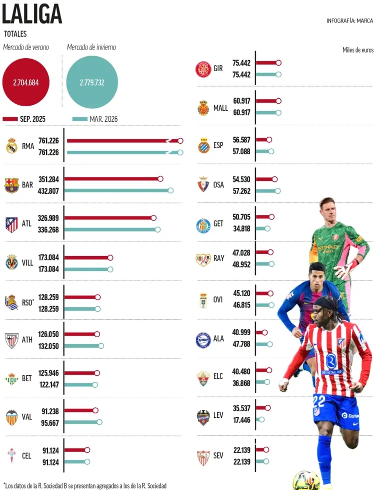 03月24日讯 每当西甲公布各俱乐部的工资上限时,同一个问题总会再次浮现:这个制约着签约、续约和转会市场运作的数字到底意味着什么?官方表格中显示的数据背后,实际上是一套复杂的财务控制体系,它决定了每家俱乐部在不损害其财务稳定性的前提下,可以在球队阵容上投入多少资金。多位专家在《马卡报》对此进行了分析。