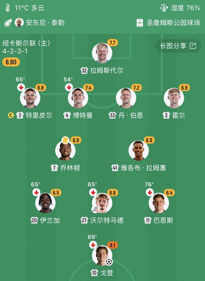 沃尔特马德本赛季为纽卡出场43次,贡献10球5助,他与球队的合同至2031年,现身价6500万欧。