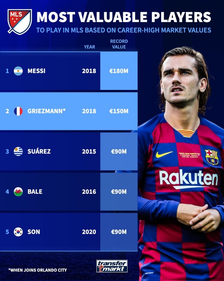 据德转统计,格列兹曼成为巅峰身价第二高的美职联球星,他的巅峰身价是2018年时的1.5亿欧,仅次于梅西的1.8亿欧。