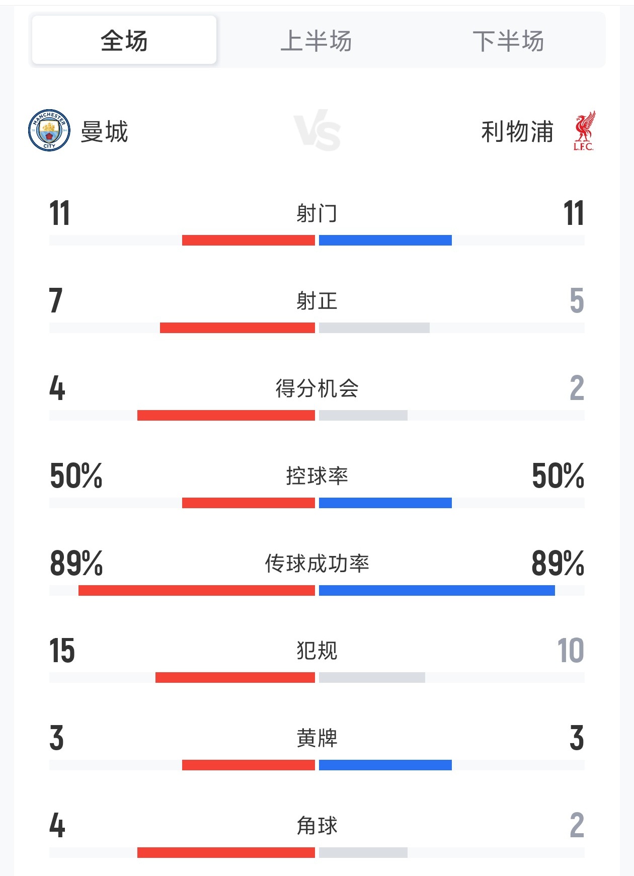 曼城4-0利物浦全场数据:射门11-11,曼城7次射正打进4球