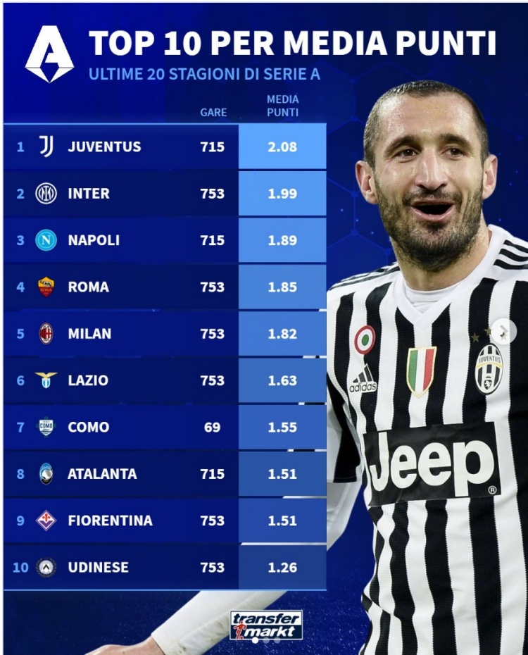 4月9日讯 德国转会市场统计了过去20个赛季意甲球队的联赛场均积分,以及总积分,并列出榜单。