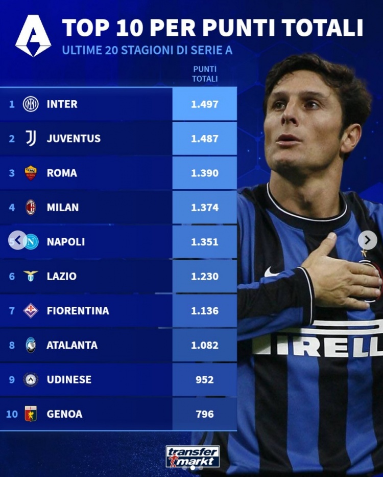 意甲过去20个赛季总积分榜:
